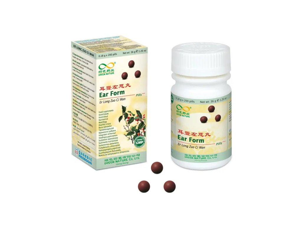Er Long Zuo Ci Wan - Ear Form (184) se z hlediska tradiční čínské medicíny používá u stavů jako je hučení, pískání či zvonění v učích, zhoršený sluch.