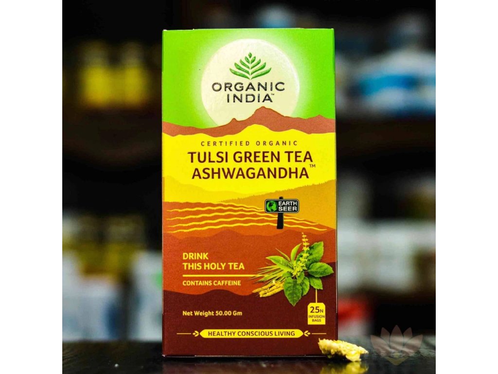 BIO bylinný čaj s ideální kombinací lahodných chutí dvou druhů ajurvédských bylin “Tulsi”, vitánie životodárné známé jako Ašvaganda a Zeleného čaje.