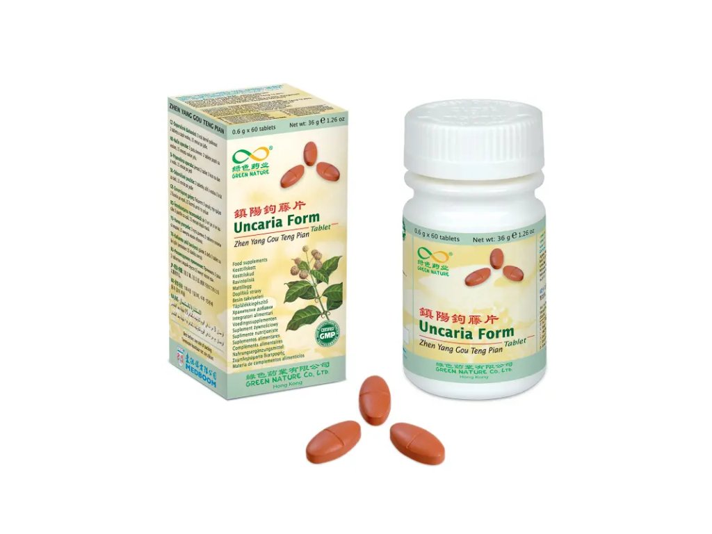 Caulis Polygoni Multiflori 16.5%, Herba Taxilli 13.5%, Herba Leonuri 10.0%, Radix Achyranthis Bidentatae 10.0%, Poria 8.5%, Ramulus Uncariae cum Uncis 8.5%, Radix Scutellariae 7.0%, Cortex Eucommiae 5.5%, Fructus Gardeniae 5.5%, Excipiens (Maize Amylum, Maize Dextrinum, Maltdextrine, Carboxymethyl Starch Sodium, Microcrystalline Cellulose, Polyvinylpyrrolidone)