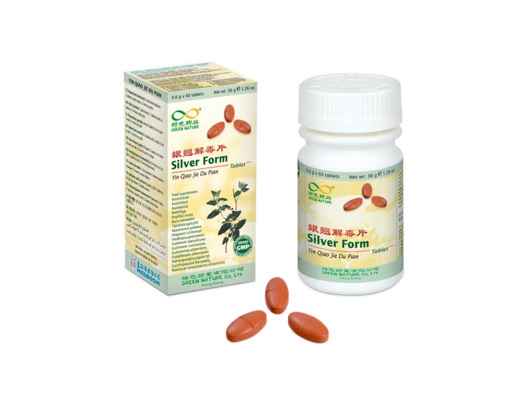 Lonicera japonica flower 102mg (17%),Forsythia suspense fruit 102mg (17%),Mentha haplocalyx 61.2mg (10.2%),Platycodon grandiflorum root 61.2mg (10.2%),Arctium lappa fruit 61.2mg (10.2%),Glycine max seed 51mg (8.5%), Glycyrrhiza uralensis root 51mg (8.5%),Lophatherum gracile leaf 40.8mg (6.8%),Schizonepeta tenuifolia 40.8mg (6.8%), Excipients (Amylum) 28.8mg (4.8%).