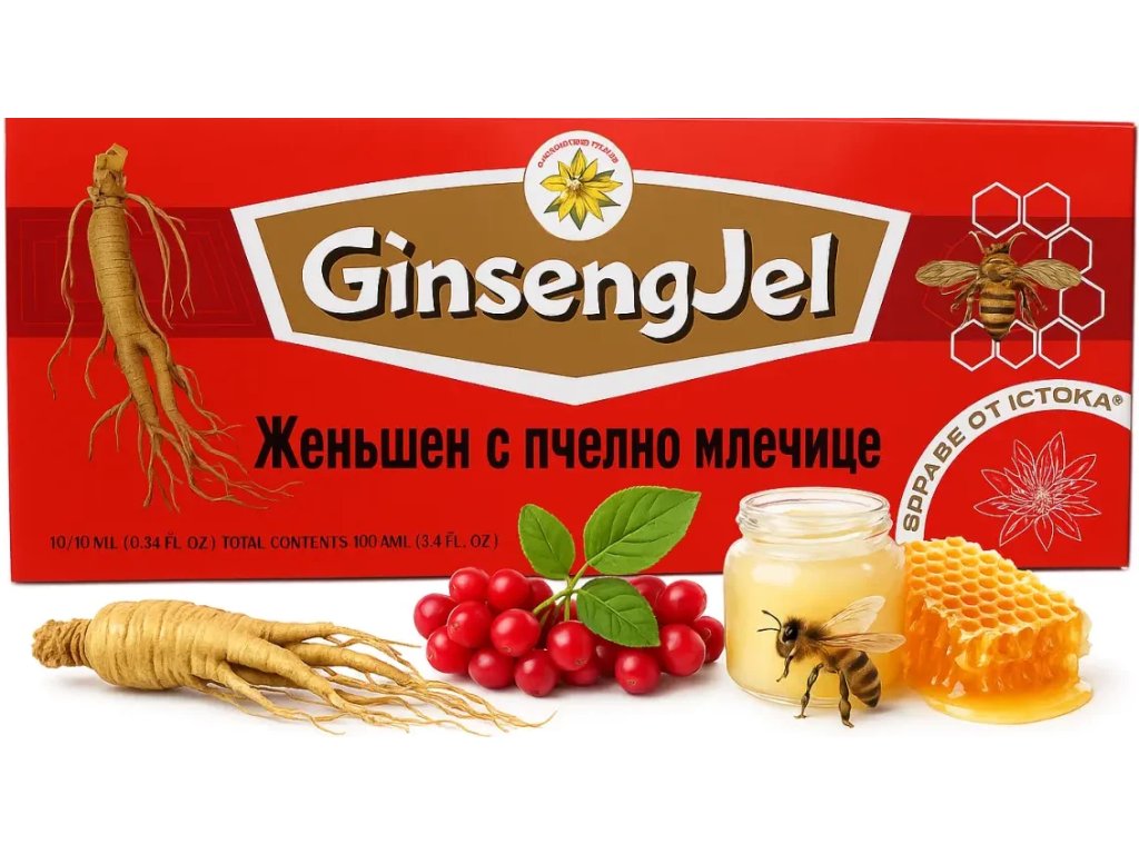 V jedné lahvičce (10 ml): Panax Ginseng (kořen) extrakt 1000 mg, mateří kašička 300 mg, Klanopraška čínská extrakt 100 mg, med, destilovaná voda, etanol méně jak 0,5%